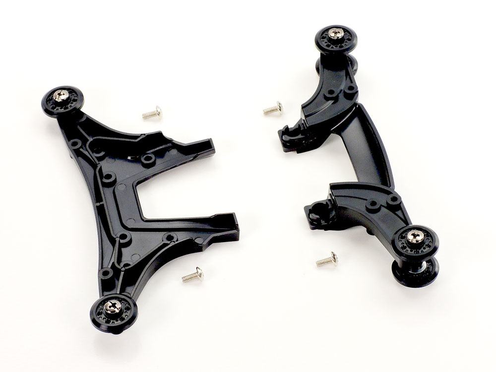 The ME is the third double shaft motor chassis after the MS and MA, and its initials are derived from its "Midship Evolution" concept. Lightweight, flexible and easy to get started with, its outstanding combination of rigidity and flex ensures a fluid drive, while the ease of assembly is very much in the vein of the MA chassis. The chassis and its A parts are molded in lightweight, tough ABS resin, and low-friction plastic bearings ensure efficient drive. Its bumpers are separately molded, and the chassis has a speedy 3.5:1 gear ratio.